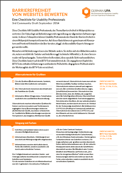 Diese Checkliste hilft Usability Professionals, das Thema Barrierefreiheit in Webprojekten zu vertreten. Der Fokus liegt auf Anforderungen mit engem Bezug zur allgemeinen Softwareergonomie. In diesen Teilaspekten können Usability Professionals den Stand der Barrierefreiheit in einem Webprojekt kompetent bewerten. Auf dieser Basis können sie gemeinsam mit Konzeptern und Frontend-Entwicklern darüber beraten, ob ggf. ein Accessibility-Experte hinzugezogen werden sollte.